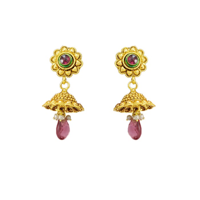 Product Code:Gold plated jhumka with flower red stone and bead 100