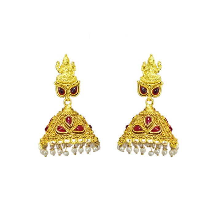 Product Code:Gold plated lakshmi jhumka with red stone and white pearls 100