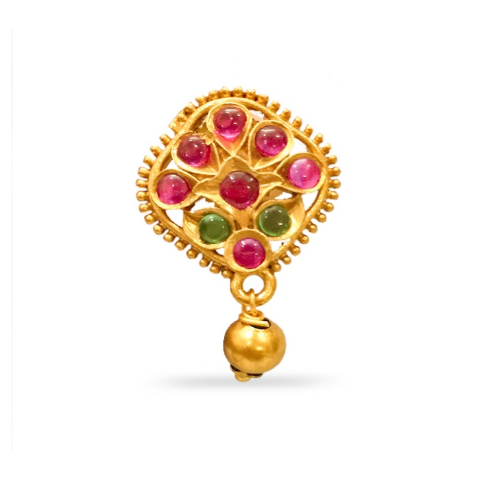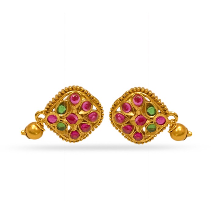 Gold Plated Stud With Green Pink Stone And Small Bead