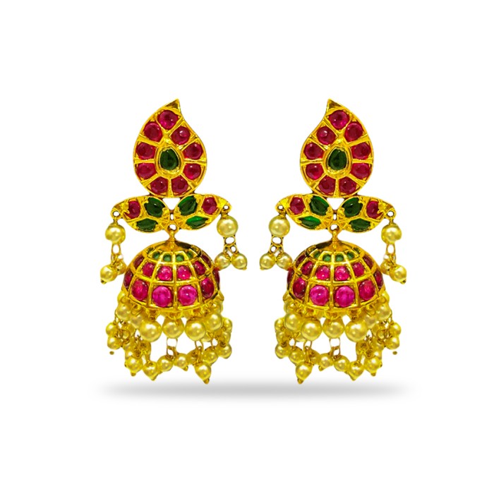Gold Plated Jhumka With Maanga Red Green And Pearls